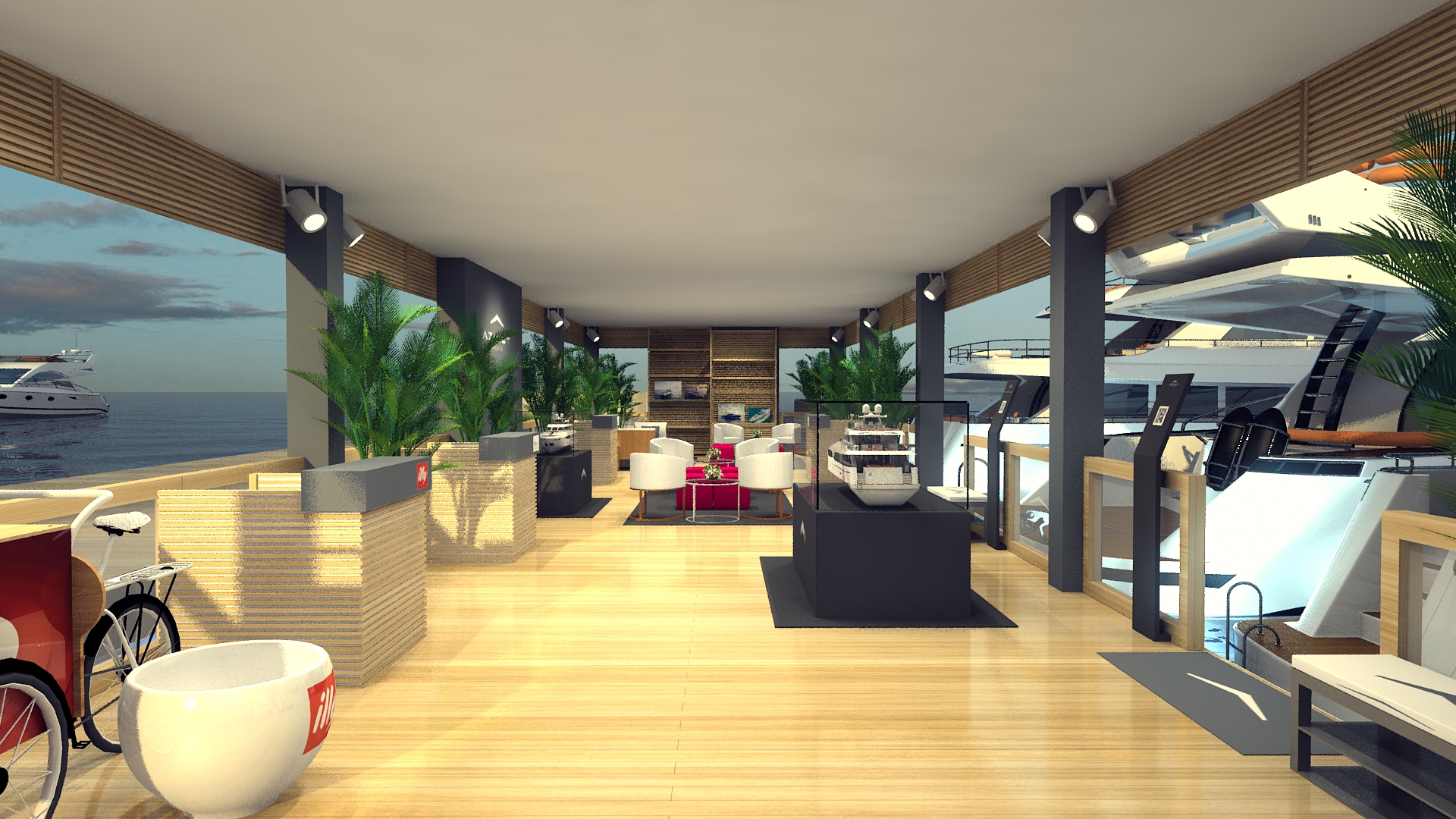 Sendo assim, o briefing incluiu a criação de um ambiente acolhedor e luxuoso que proporcionasse momentos de networking em um lounge especial, atendimento em balcão ripado, além de uma cafeteria e bar com fácil acesso aos iates ancorados. Então, cada detalhe da cenografia foi pensado para refletir as orientações do cliente e a sofisticação que a marca Azimut representa.